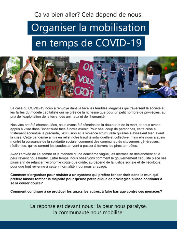 Les mobilisations locales soutiendront que les ravages sociaux et économiques causés par la pandémie doivent être réparés en investissant massivement dans les services publics et les programmes sociaux et en nous protégeant dès maintenant contre la crise climatique qui pointe à l’horizon, faisant – selon l’écrasante majorité des scientifiques – peser sur l’humanité une menace existentielle, incluant celle de la multiplication des pandémies. Comme on peut le voir avec la pandémie de COVID-19, ces contextes de crise ne feront que creuser davantage les inégalités en affectant plus durement les personnes les plus vulnérables et marginalisées.