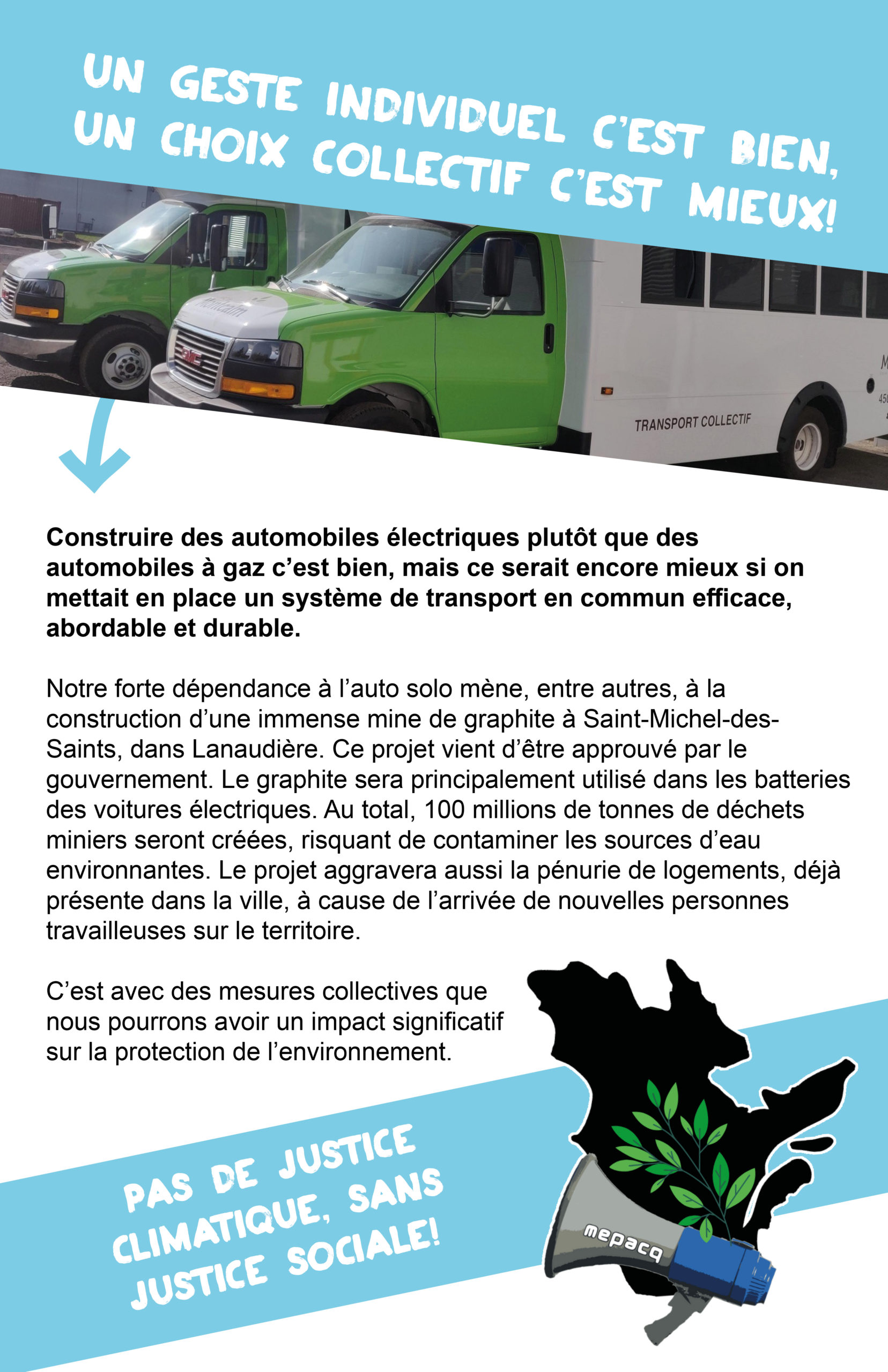 La demande d’une transition juste et verte par des mesures concrètes, comme l’abandon de tout projet extractiviste et le rejet de l’austérité, se veut au cœur de la présente mobilisation. La science est évidente et rappelle constamment l’urgence d’une action climatique forte, maintenant ou jamais.